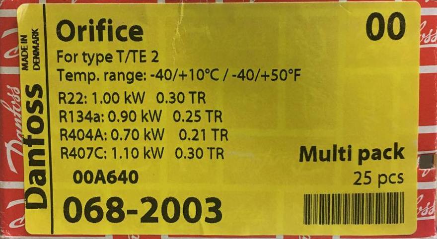 Клапанный узел (дюза) TE 2, 00, 068-2003 производства Danfoss предназначен для дозирования хладагента в испарительной части холодильного контура; его рабочие параметры выражаются в эквивалентной тепловой нагрузке: при использовании R22 в диапазоне температур −40…+10 °C обеспечивает дозирование, соответствующее тепловой нагрузке до 1,0 кВт; при использовании R134a в том же диапазоне — до 0,9 кВт; при работе с R404A и R507 — до 0,7 кВт в диапазоне −40…+10 °C и при пониженных температурах −60…−25 °C.