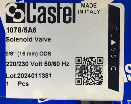СОЛЕНОИДНЫЙ КЛАПАН С КАТУШКОЙ CASTEL, 5/8"-16mm ODS, Kv=2,61 м3/час, 230V, 1078/5A6