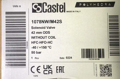 СОЛЕНОИДНЫЙ КЛАПАН CASTEL без катушки, 42 mm ODS, Kv [m³/h]=25, 1078NW/M42s, Италия