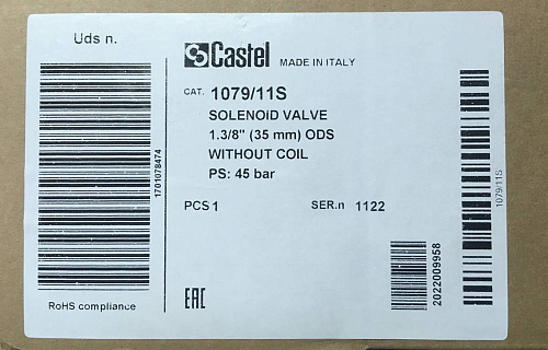 СОЛЕНОИДНЫЙ КЛАПАН CASTEL без катушки, 1.3/8"-35mm ODS, Kv=10 м3/час, 1079/11s, Италия