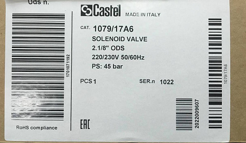 КЛАПАН СОЛЕНОИДНЫЙ С КАТУШКОЙ CASTEL Solenoid Valve 2.1/8" ODS 220-230V, 1079/17A6