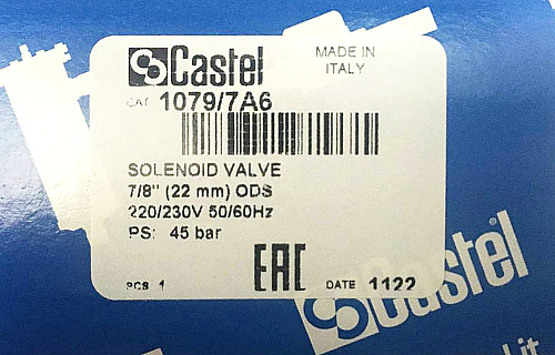КЛАПАН СОЛЕНОИДНЫЙ С КАТУШКОЙ CASTEL, 7/8"-22mm ODS, 220-230V, 1079/7A6