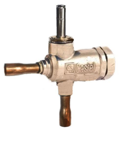 Электромагнитный клапан Castel предназначен для работы с горячим газом и маслом; он рассчитан на эксплуатацию в температурном диапазоне от −40 до +130 °C и на рабочие давления до 130 бар. Поршневой исполнительный механизм обеспечивает герметичное перекрытие потока при высоких давлениях, а коэффициент пропускной способности Kv ≈ 0,32 м3/ч характерен для устройств, предназначенных для управления малыми расходами.