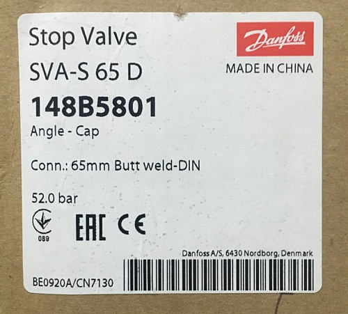 Запорный вентиль Danfoss SVA-S 65 D (код 148B5801) предназначен для эксплуатации в системах промышленного холода и рассчитан на рабочий температурный диапазон от −60 до +120 °C; предельно допустимое рабочее давление составляет 52 бар; пропускная способность выражена коэффициентом Kv и соответствует примерно 120 м3/ч при полном открытии, присоединительные патрубки рассчитаны на диаметр 65 мм для пайки по стандарту DIN.