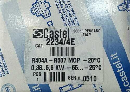 Терморасширительный вентиль Castel, модель 2234/4E (маркировка включает обозначение MOP-20), предназначен для работы с хладагенатами R404A и R507; рабочий температурный диапазон устройства составляет от −60 °C до +120 °C, а максимально допустимое рабочее давление — 34 бар.