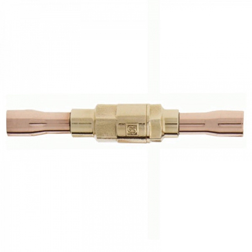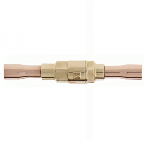 Корпус выполнен с наружным соединением под пайку (ODS) диаметром 22 мм (7/8"), что обеспечивает прямую установку в медные трубопроводы; внутренняя запорная часть обеспечивает односторонний поток хладагента и быстрое перекрытие при обратном напоре, снижая риск обратного тока и гидравлических воздействий на контур.
