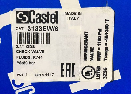 КЛАПАН ОБРАТНЫЙ CASTEL Check Valve CO2 PS=80bar 3/4" ODS, 3133EW/6