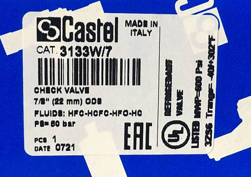 ОБРАТНЫЙ КЛАПАН С УСИЛЕННОЙ ПРУЖИНОЙ CASTEL Check Valve, 7/8"-22 mm ODS, 3133W/7