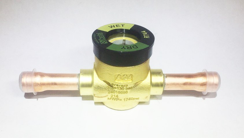 Конструктивно изделие выполняет функции прозрачного окна для наблюдения за потоком жидкой фазы и содержит встроенный индикатор влагосодержания, позволяющий оперативно оценивать наличие влаги в хладоносителе и необходимость замены фильтра‑сушителя. Смотровое стекло с индикатором рекомендуется устанавливать в жидкостной линии; вариант без индикатора может применяться на линии возврата масла из маслоотделителя.