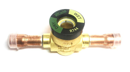 Корпус и присоединительные патрубки выполнены с учётом требований к паяному монтажу и рабочему давлению оборудования для CO2; индикатор реализован в виде влагочувствительного элемента, изменяющего визуальные характеристики при наличии влаги, что позволяет оценить необходимость замены фильтра‑осушителя без демонтажа узла.