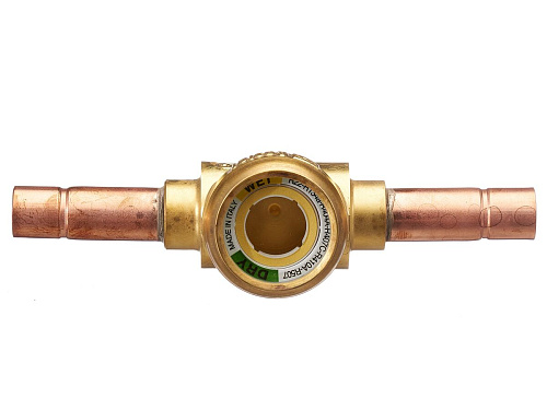 Конструкция предусматривает интегрированный индикатор влажности, обеспечивающий визуальную оценку присутствия влаги в хладагенте и служащий индикатором необходимости замены фильтра‑сушителя; элемент устанавливается в жидкостной линии методом пайки в точке, где требуется контроль состояния хладагента. При отсутствии индикатора аналогичные смотровые стекла применяются для контроля возврата масла из маслоотделителя.