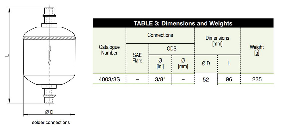 Соединение выполнено под пайку по технологии ODS с наружным диаметром 3/8", обеспечивая герметичное встраивание в жидкостную линию методом пайки. Корпус и внутренняя компоновка рассчитаны на эксплуатацию при температурных режимах от −40 до +80 °C и на максимально допустимое рабочее давление до 42 бар.