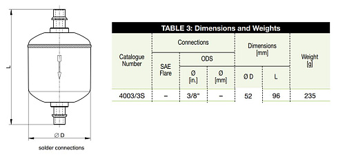 Фильтр-осушитель Castel 4003/3S (международный код 033S) предназначен для удаления влаги и механических примесей из хладагентного контура; внутренний объём сорбционной камеры составляет примерно 50 см³, что определяет пропускную способность и ёмкость по влагоудержанию для коротких участков магистрали.