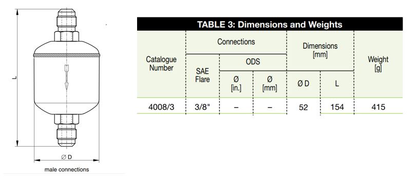 Фильтр-осушитель Castel модели 4008/3 с фланцевыми соединениями типа SAE Flare предназначен для установки непосредственно в линию хладагента; внутренний объём рабочей камеры составляет 130 см³, конструкция рассчитана на работу при температуре окружающей среды и среды от −40 до +80 °C и на максимальное рабочее давление до 42 бар.