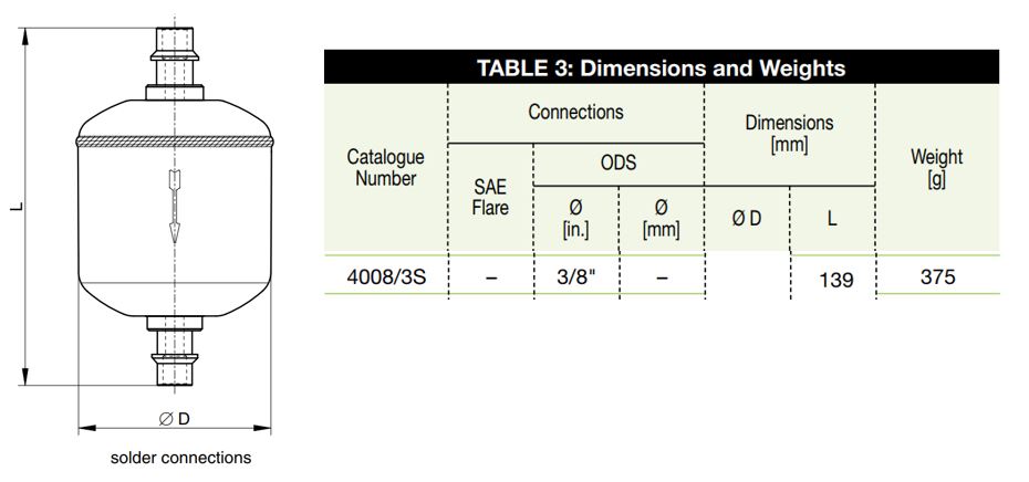 Конструкция представляет собой герметичный корпус с пайным соединением ODS диаметром 3/8", обеспечивающим прямой монтаж к трубопроводам указанного наружного диаметра. Внутреннее пространство разделено на зоны адсорбции и механической фильтрации для последовательного удаления влаги и твёрдых частиц без доступа внешней атмосферы, что снижает риск образования коррозии и контаминации системы.