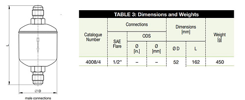 Корпус оснащён фланцевыми (flare) соединениями по стандарту SAE диаметром 1/2" на входе и выходе, что обеспечивает совместимость с линиями, выполненными под флейровые фитинги, и упрощает монтаж в существующие магистрали. Конструкция включает внутренний фильтрующий элемент и осушающий наполнитель, размещённые в одном объёме, что обеспечивает совместное удаление влаги и твёрдых частиц из хладагента при протоке через аппарат.
