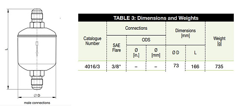 Конструкция рассчитана на встраивание в линейные участки трубопровода: вход и выход имеют идентичные соединения SAE flare диаметром 3/8", что упрощает установку в системах с соответствующей фитинговой спецификацией. Внутренняя компоновка предусматривает последовательную адсорбционную и механическую очистку потока, обеспечивая удаление как влаги, так и твёрдых включений при заявленных давлении и температуре.