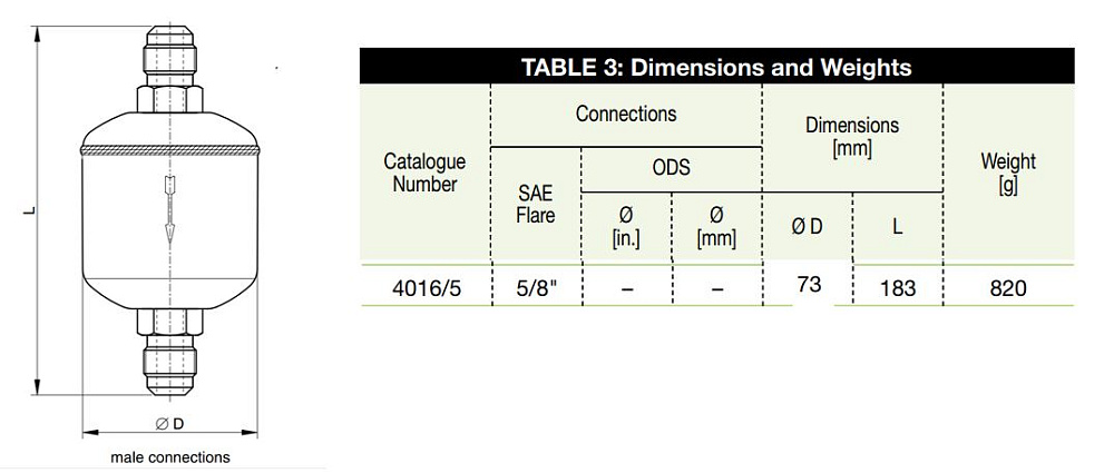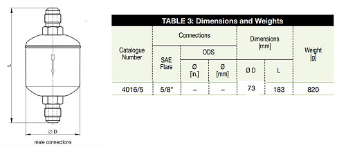 Конструкция рассчитана на включение в трубопроводы с фланцевыми соединениями типа Flare: вход и выход выполнены под соединения 5/8" по SAE, что обеспечивает прямую последовательную установку в линию контура. Внутренний объём определяет ёмкость влагопоглощающей загрузки и влияет на интервал между обслуживанием и заменой.