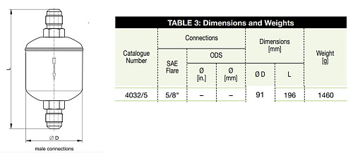 Фильтр‑осушитель Castel 4032/5 (международный код 305) представляет собой полнопроходное устройство с внутренним объёмом порядка 500 см³, рассчитанное на эксплуатацию в температурном диапазоне от −40 °C до +80 °C и выдерживающее рабочее давление до 42 бар; подключение к магистрали выполнено через фларовые соединения 5/8" SAE на входе и выходе.