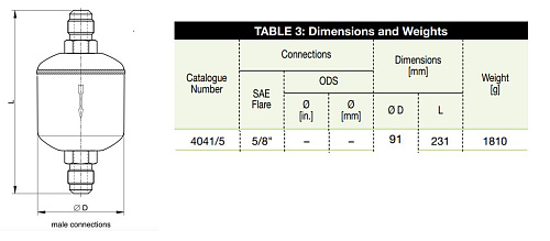 Корпус выполнен для подключения посредством фланцевых (flare) фитингов с типоразмером 5/8" SAE на входе и выходе, что обеспечивает прямое присоединение к магистралям соответствующего диаметра. Внутренняя компоновка включает фильтрующий элемент и сорбционный наполнитель, расположенные в рабочей полости корпуса для последовательного задержания механических частиц и абсорбции влаги.