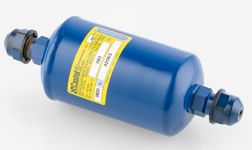 Фильтр-осушитель предназначен для осушки и механической фильтрации хладагента в холодильных контурах; внутренняя загрузка состоит из смеси 80% молекулярного сита и 20% оксида алюминия с номинальным объёмом заполнения 130 см³, изделие поставляется под брендом Castel (международный код 083).