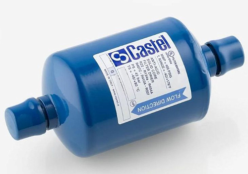 Фильтр-осушитель предназначен для механической очистки и адсорбции влаги в холодильных магистралях; внутренний полезный объём активного слоя составляет 250 см³, рабочий температурный диапазон от −40 до +80 °C обеспечивает применение при низких и умеренных температурах, а расчётное максимально допустимое рабочее давление — 45 бар. Соединение для встраивания выполнено под пайку с присоединительным диаметром 1/2". Изготовитель — Castel, модель идентифицируется кодом 4216/4S (международный код 164S).