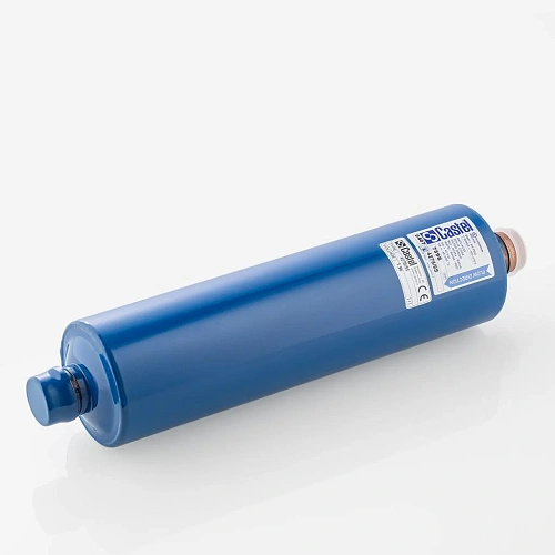 Корпус выполнен в исполнении для пайки с ODS‑соединением диаметром 1 1/8", что обеспечивает прямую интеграцию в медные трубопроводы методом биметаллической пайки; внутри расположен адсорбентный наполнитель в виде гранулированного слоя, обеспечивающего совместную функцию осушения и механической фильтрации хладагентоносителя.