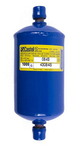 Фильтр‑осушитель Castel 1/2" ODS, модель 4308/3S (международный код 084S) представляет собой комбинированный компонент для очистки и осушки хладагента; номинальный объём корпуса составляет 130 см³, площадь фильтрации — 103 см², рабочий температурный диапазон от −40 до +80 °C и максимальное рабочее давление до 42 бар определяют эксплуатационные пределы применения.