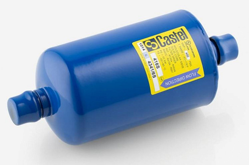 Фильтр-осушитель CASTEL Solid Core Drier с присоединением 3/4" ODS (пайка) предназначен для установки в жидкостную линию холодильных контуров и выполняет функции удаления влаги и механических примесей из хладагентоносителя, снижая риск образования коррозионно-активных соединений и засорения терморегулирующих аппаратов.
