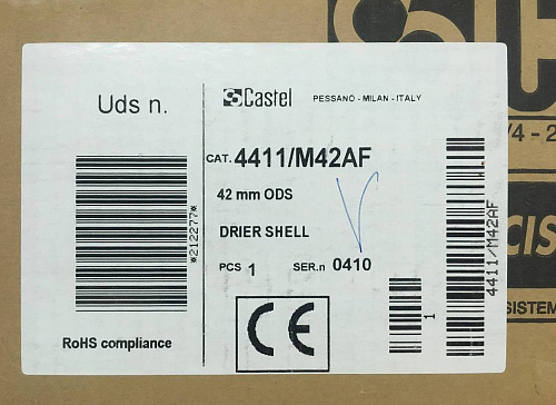 Корпус фильтра-осушителя Castel модели 4411/M42AF представляет собой одноотсековый кожух для установки сменного осушающего сердечника с внутренним объёмом порядка 800 см3; рассчитан на рабочие температуры в диапазоне от −40 до +80 °C и выдерживает максимальное рабочее давление до 50 бар.