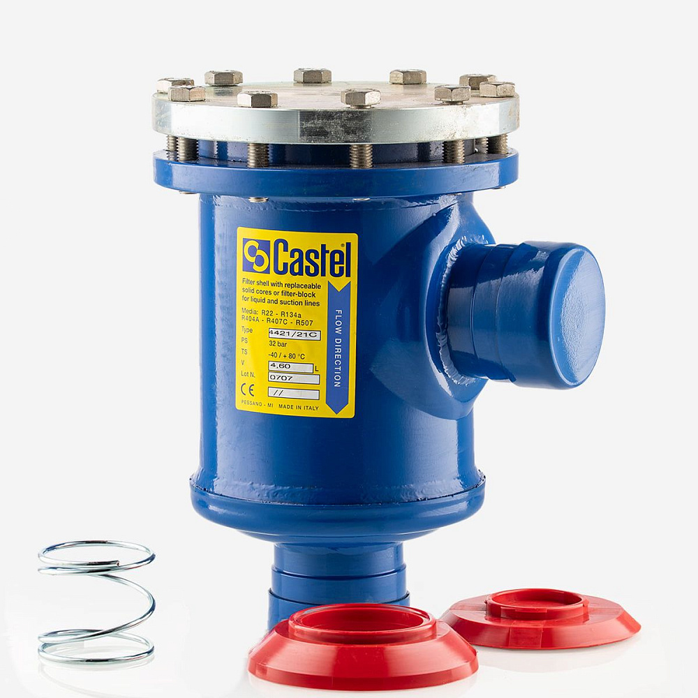 Корпус фильтра Castel Filter Shell 2.5/8"-67 mm ODS (механический) предназначен для улавливания и удержания механических включений в потоке хладагента на линии всасывания компрессора. Расчетные эксплуатационные пределы предусматривают работу при температурах от −40 до +80 °C и выдерживание рабочего давления до 45 бар, что определяет пригодность для широкого диапазона холодильных контуров.