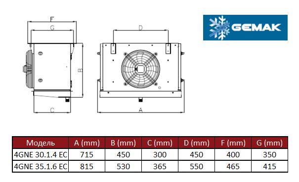 Воздухоохладитель GEMAK (Турция) 4GNE 35.1.6 EС, 4мм, 1*350мм, 4,3 кВт (-8/delta8), электрооттайка
