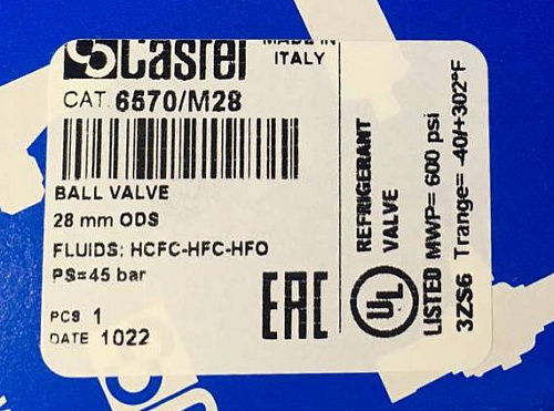 ШАРОВОЙ ВЕНТИЛЬ CASTEL, 28mm ODS, Kv=51 м3/час, 6570/M28