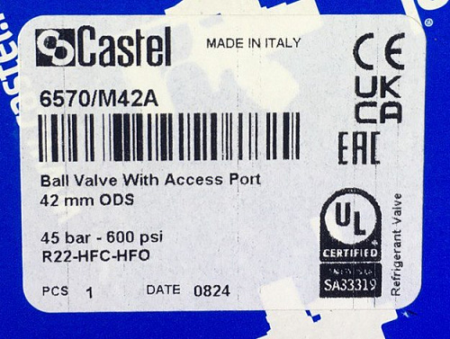 Вентиль шаровой Castel Ball Valve 42 mm ODS - Access Port, 6570/M42A предназначен для использования в системах охлаждения, заморозки и кондиционирования воздуха. Он обеспечивает надежное запирание линий жидкости, всасывания и горячего газа благодаря рабочему диапазону температур от -40 до +150 °C. Диаметр проходного отверстия составляет 40 мм, что позволяет вентилю работать под максимальным рабочим давлением до 45 бар и пропускной способностью до 117 м³/ч.