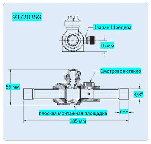 Конструкция вентиля включает в себя смотровое стекло, что позволяет визуально контролировать поток рабочей среды. Вентиль оснащён запорным механизмом шарового типа, который обеспечивает надежное перекрытие жидкостей и газов. Соединение пайка диаметром 3/8" обеспечивает простую и надежную установку в различных системах.