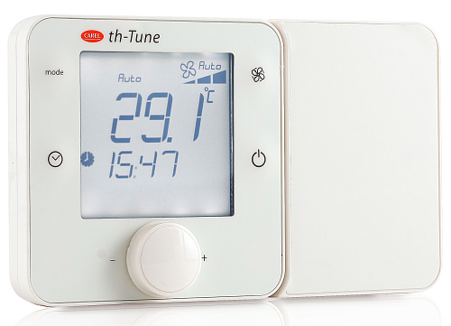 Пользовательский настенный терминал CAREL семейства th‑Tune UAT предназначен для локального задания уставок и передачи измеренных значений в программируемый контроллер; питание осуществляется от сети переменного тока 230 В, в корпусе интегрирован датчик температуры, обеспечивающий регистрацию комнатной температуры для управления климатическим контуром.
