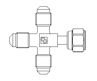 Т-фитинг предназначен для присоединения трех трубопроводных ветвей с резьбовыми соединениями стандарта SAE диаметра 1/4" и рассчитан на максимальное рабочее давление 45,0 бар; одно из подключений выполнено в исполнении SAE-Sw (вращающаяся гайка/сужествующее сервисное соединение), одно подключение реализовано как внутренняя резьба для ввода ответвления.
