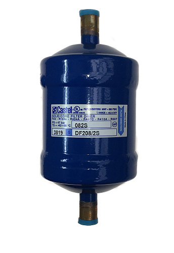 Фильтр‑осушитель CASTEL DF208/2S предназначен для удаления влаги и механических примесей из хладагента и оснащён антикоррозионной/антикислотной функциональностью; внутренний рабочий объём адсорбента составляет примерно 130 см³, изделие рассчитано на эксплуатацию в температурном диапазоне от −40 до +80 °C при максимальном рабочем давлении до 50 бар, присоединение к магистрали выполняется методом пайки по наружному диаметру 1/4".