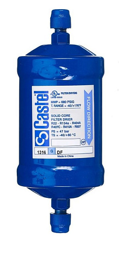 Фильтр-осушитель Castel DF216/3 представляет собой корпусное изделие с внутренним объёмом активного заполнения 250 см3, предназначенное для механической фильтрации и осушки хладоносителя при эксплуатации в диапазоне температур от −40 °C до +80 °C и при номинальном рабочем давлении до 50 бар.