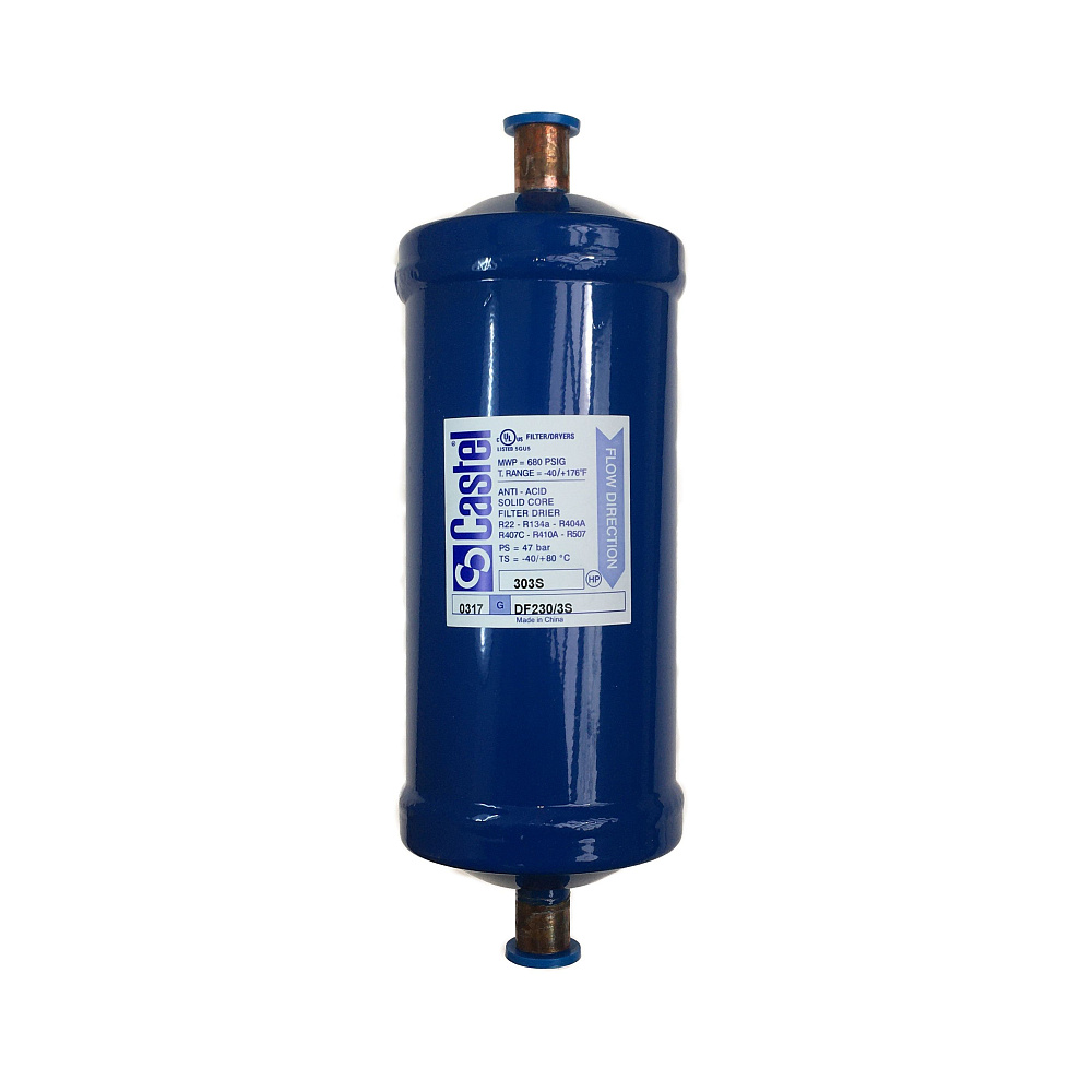 Фильтр‑осушитель CASTEL DF230/3S предназначен для удаления влаги и твердых примесей из хладоносителя в системах хладоснабжения; номинальный внутренний объём рабочей камеры составляет примерно 500 см3, допускается эксплуатация при температуре среды от −40 °C до +80 °C и при рабочем давлении до 50 бар; присоединение к трубопроводу выполнено в виде пайки по наружному диаметру 3/8".