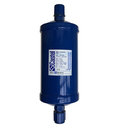 Фильтр-осушитель антикислотного типа Castel DF241/5 предназначен для установки в холодильных контурах и сочетает в себе функции механической фильтрации и влагопоглощения; номинальный объём внутреннего наполнителя составляет примерно 670 см³, рабочий температурный диапазон устройства простирается от −40 °C до +80 °C, максимальное допустимое рабочее давление — 50 бар.