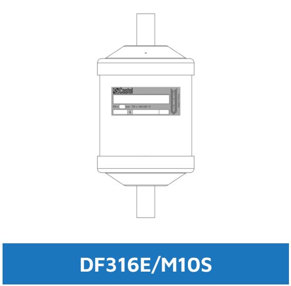 Фильтр-осушитель CASTEL CO2 DF316E/M10S предназначен для установки в магистрали хладагента CO2 и обеспечивает удаление влаги и механических примесей из рабочей среды; внутренняя ёмкость заполнителя составляет порядка 250 см3, что определяет объём адсорбирующего и фильтрующего материала, задействованного в процессе очистки.