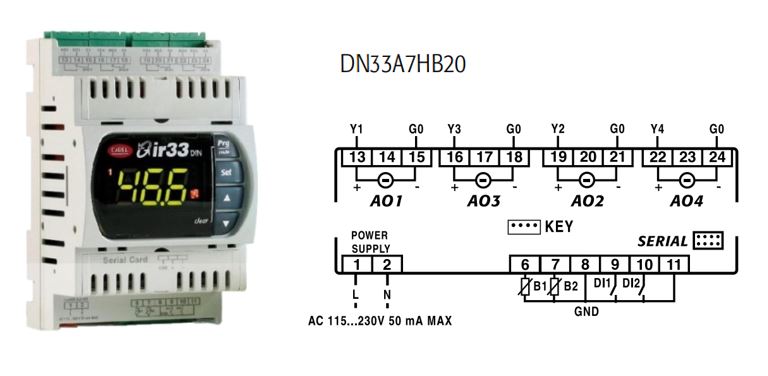 КОНТРОЛЛЕР УНИВЕРСАЛЬНЫЙ CAREL DN33 UNIV 2NTC/PTC/PT1000, 4SSR, BUZ, IR, 115 to 230 Vac, RTC