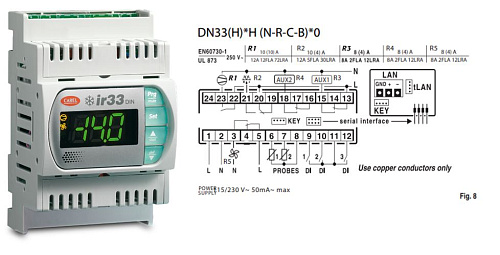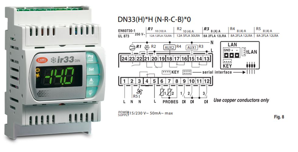 КОНТРОЛЛЕР CAREL IR33 DIN 2HP, 16A, 8A, 8A, 8A RTC IR 115 TO 230 VAC BUZ 2NTC 3D.I. SCREW TERMINALS