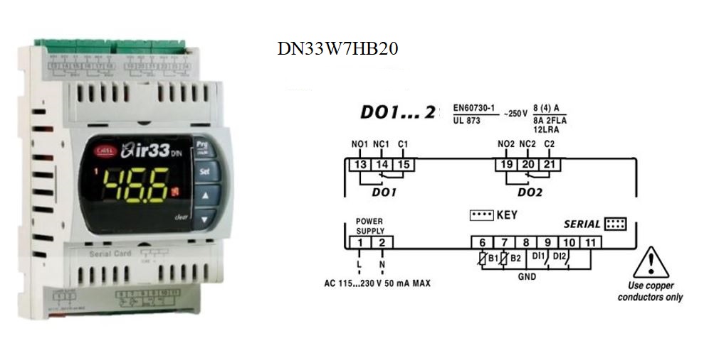 УНИВЕРСАЛЬНЫЙ КОНТРОЛЛЕР CAREL DN33, 2NTC/PTC/PT1000, 2 relays, BUZ, IR, 115 to 230 Vac, RTC