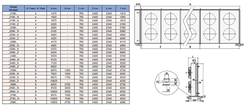 Конструкция выполнена в исполнении с горизонтальным воздушным потоком (H) и комплектуется четырнадцатью вентиляторами диаметром 900 мм, что обеспечивает суммарный расход воздуха порядка 282 800 м3/ч; присоединительные патрубки для входа и выхода теплоносителя выполнены под фланцевое соединение диаметром 4". Уровень звукового давления на расстоянии 10 м составляет 57 dBA, что следует учитывать при размещении в технических зонах и при проектировании акустических мер.