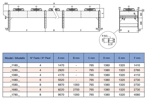 Агрегат выполнен с вертикальным направлением воздушного потока и оснащён тремя вентиляторами диаметром 800 мм, обеспечивающими расчётный расход воздуха порядка 57 900 м³/ч; патрубки подсоединения гидравлической линии выполнены под фланцевые соединения диаметром 3″, что обеспечивает интеграцию в типовые промышленные трубопроводы. Уровень звукового давления, измеренный на расстоянии 10 м, составляет 53 дБ(А).
