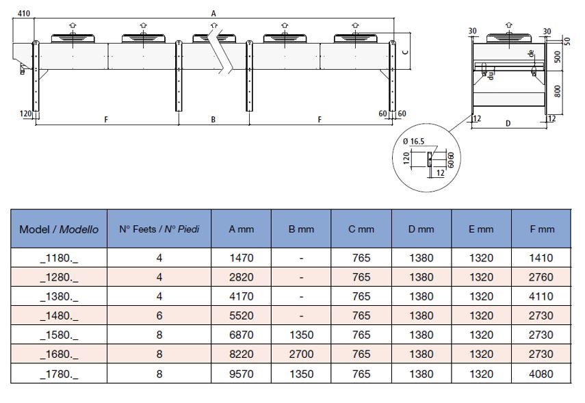 Конструктивно агрегат имеет вертикальный тип воздушного потока (V), при котором два крупных осевых вентилятора формируют направленный поток через рулонный теплообменник с распределённым трубным пакетом; такое исполнение обеспечивает высокую интенсивность теплообмена при относительно компактной площади основания. Трубный объём и площадь теплообмена рассчитаны на работу с гликолевыми контурами и соответствуют указанным гидравлическим параметрам, что облегчает гидравлическую интеграцию в существующие системы вторичного охлаждения.