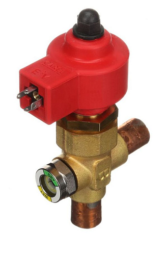 Конструкция включает узкое проходное сечение с малой пропускной способностью для ступенчатой или непрерывной модуляции расхода и электронный привод шагового типа, требующий внешнего контроллера и питания; в корпус вмонтировано смотровое стекло для визуальной проверки фазового состояния хладагента и контроля наличия пузырьков/жидкости на линии.