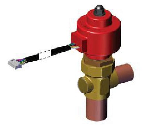 Конструктивно вентиль выполнен с шаговым электроприводом, обеспечивающим прецизионное позиционирование керна при управлении потоком; управление положением привода осуществляется внешним контроллером, принимающим сигналы с датчиков давления и температуры, размещённых на всасывающей линии. Монтажный интерфейс рассчитан на пайку, что обеспечивает компактное и надёжное соединение с трубопроводом и минимизирует гидравлические переходные сопротивления.
